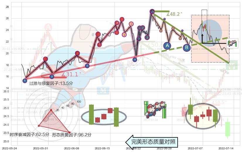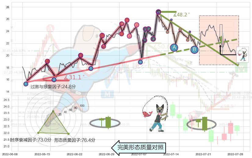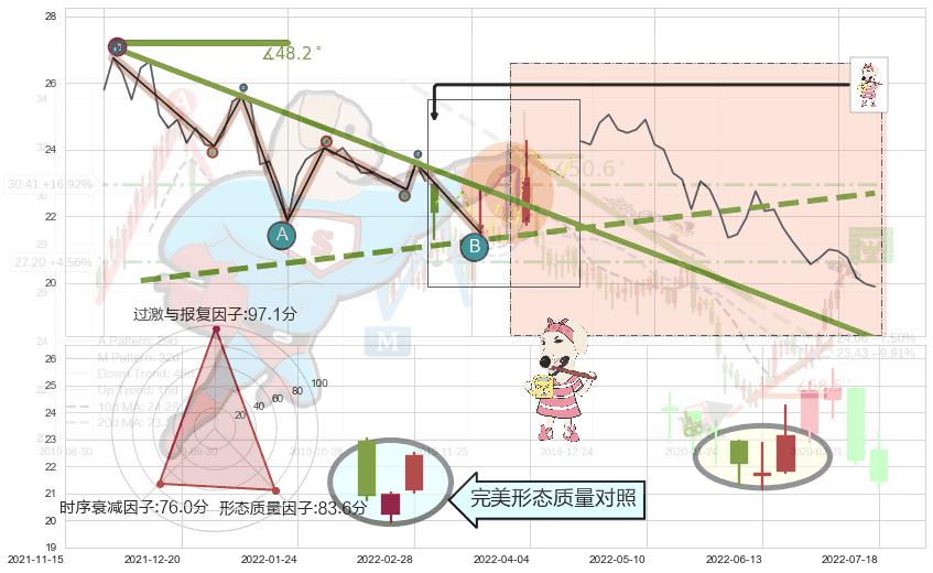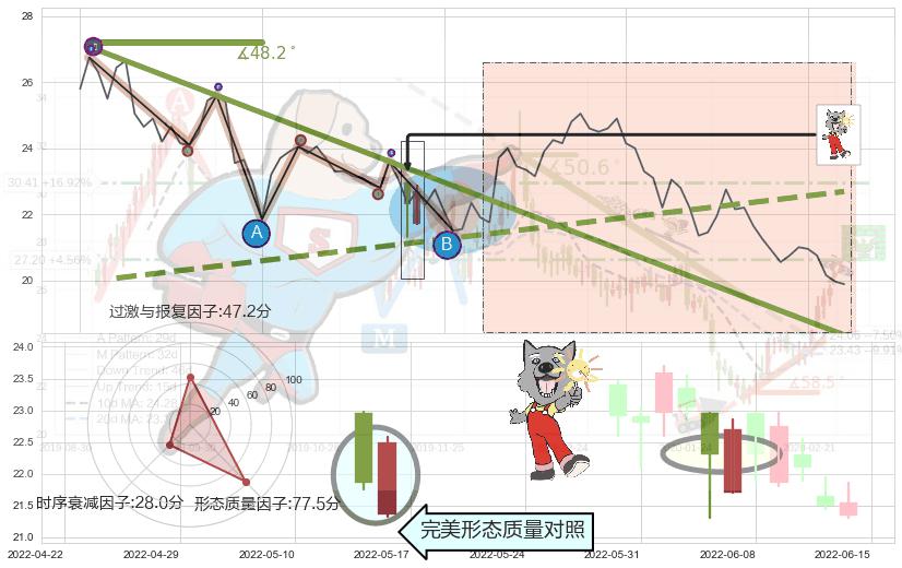 ➢ 2021-09-20-2022-04-13上升趋势存在反转[风险],其原上升趋势的支撑位(22.69)已破位[强阻力信号],原上升趋势角度: 31.1˚