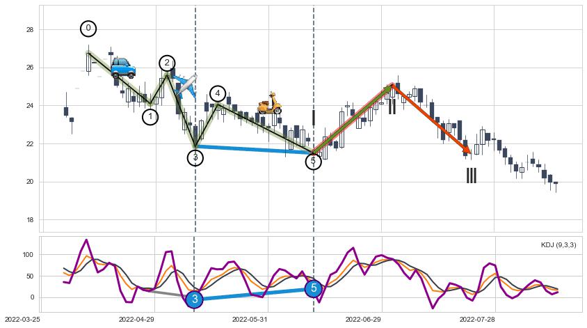 ➣ 第三,五驱动浪端点:【KDJ】走势出现【常规背离 & 反转信号】背离程度99.00%,背离夹角角度27.1˚,背离程度较大