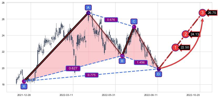 ➣ 谐波伽利:c下跌到达d:猜想拉升 → 上涨 →【拐点】强支撑临近 → 大趋势均值回复