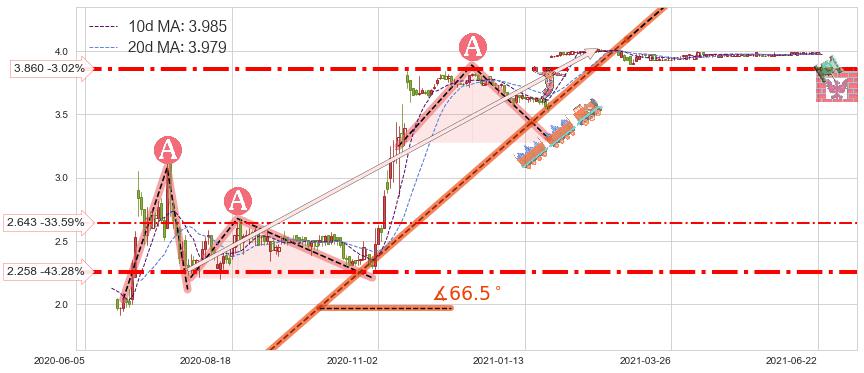 ♘ 支撑价格位3.860,可信任强度78.42%,距离最后交易2021-06-23形成的收盘价格3.980相差 -3.02%