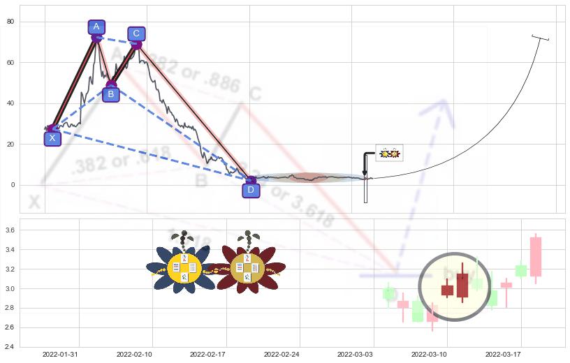 ➢ 谐波螃蟹:c下跌到达d:猜想拉升 → 上涨 →【拐点】强支撑临近 → 大趋势均值回复
