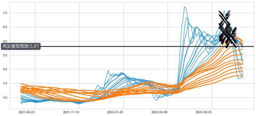 ➣ 40小时均线于(2022-07-25: 6.20)形成【死叉】基于【死叉历史模型】预测死叉后最低波谷价格: 5.73, 死叉后最低价格4.52,已经下跌超出预测最低波谷价格, 预期反弹