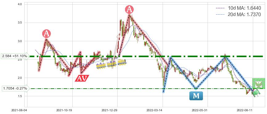 ♘ 阻力价格位2.584,可信任强度95.17%,距离最后交易2022-08-12形成的收盘价格1.7100相差 +51.10%