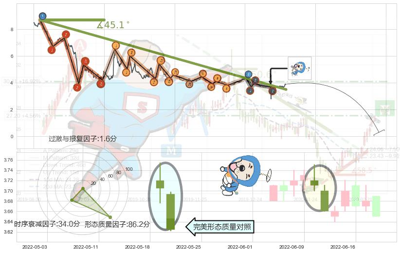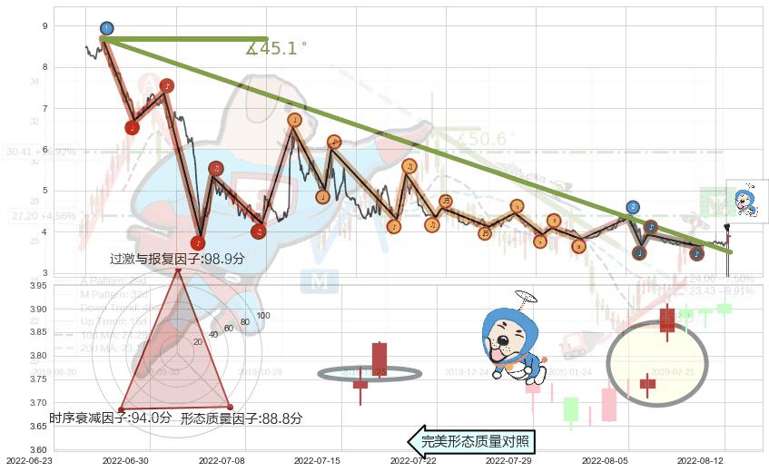 从2019-10-11至2022-08-11,共包含698个交易日,阶段股价下跌-60.75%,阶段股价变动位移路程比: 1 : 16,下跌趋势角度: 45.1