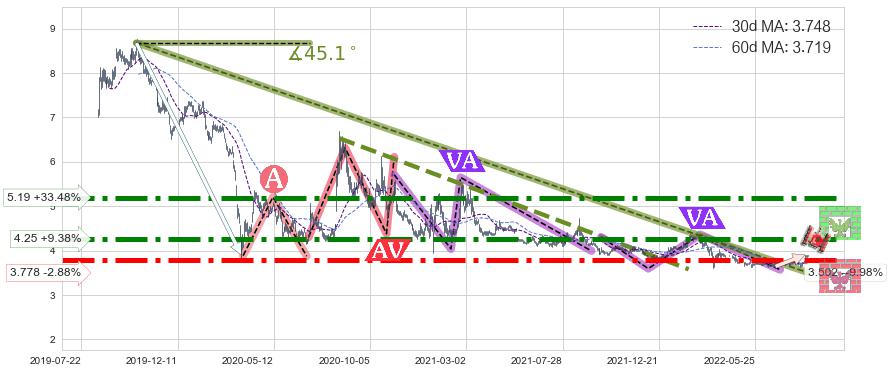♘ 在最后的下跌阶段2019-10-11至2022-08-11,存在 破位边缘的阻力位 ,阻力价格3.502,可信任强度72.97%,其距离最后价格3.890相差 -9.98%