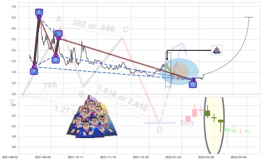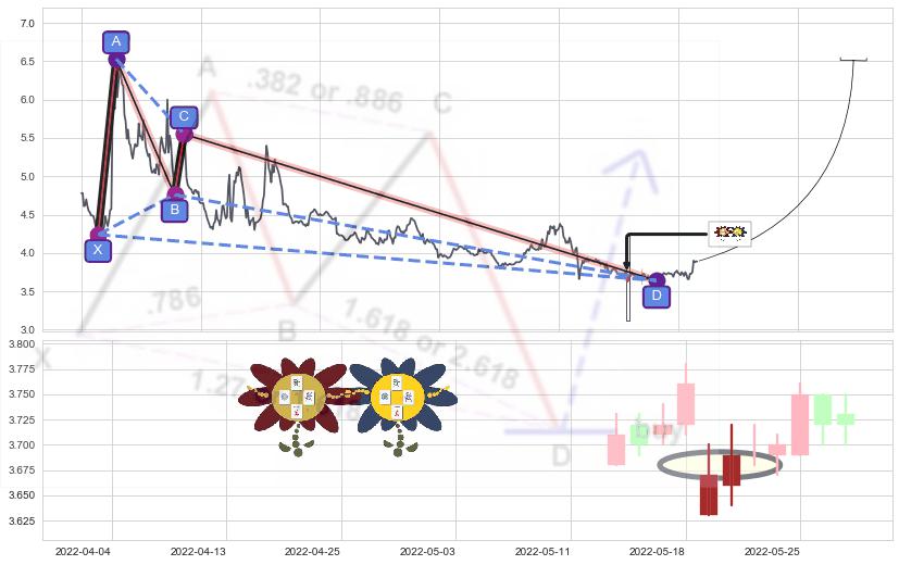➢ 谐波蝴蝶:c下跌到达d:猜想拉升 → 上涨 →【拐点】强支撑临近 → 大趋势均值回复
