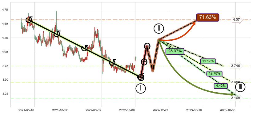 ➣ 循环浪继续向下【平均值】位置(2023-09-15, 3.458),匹配聚类样本比例45.06%, 可能性概率12.78%