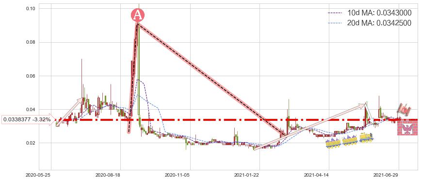2021-06-22: 第一支撑位0.0338377有效抑制了下跌浪,成功阻止了价格的继续下跌。