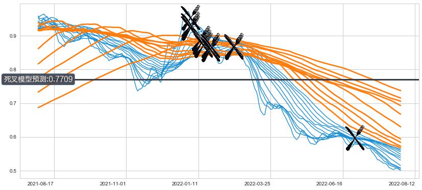 ➢ 60小时均线于(2022-02-17: 0.8640)形成【死叉】基于【死叉历史模型】预测死叉后最低波谷价格: 0.8047, 死叉后最低价格0.48500,已经下跌超出预测最低波谷价格, 预期反弹