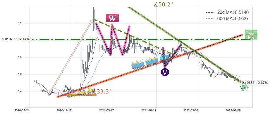 🦴 长线均值回复组合短线趋势跟踪[强阻力信号]2021-03-03-2022-08-12下跌趋势依然成立(下跌趋势跟踪依然存在),短线价格略微上行反弹(均值回复猜想),即将接近下跌趋势提供的未破位阻力价格:0.49667。