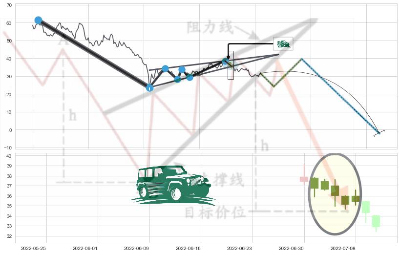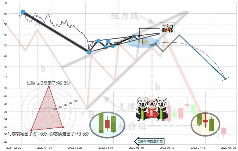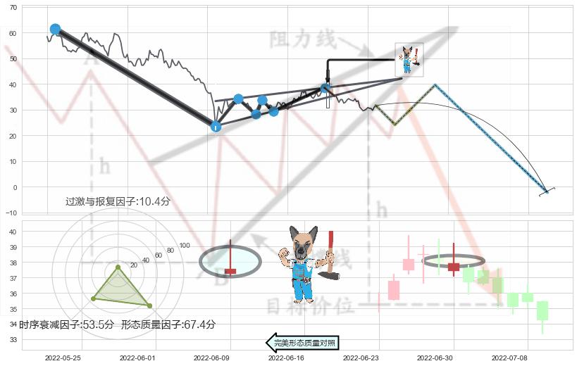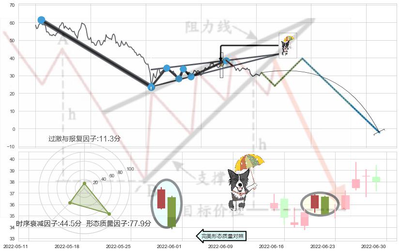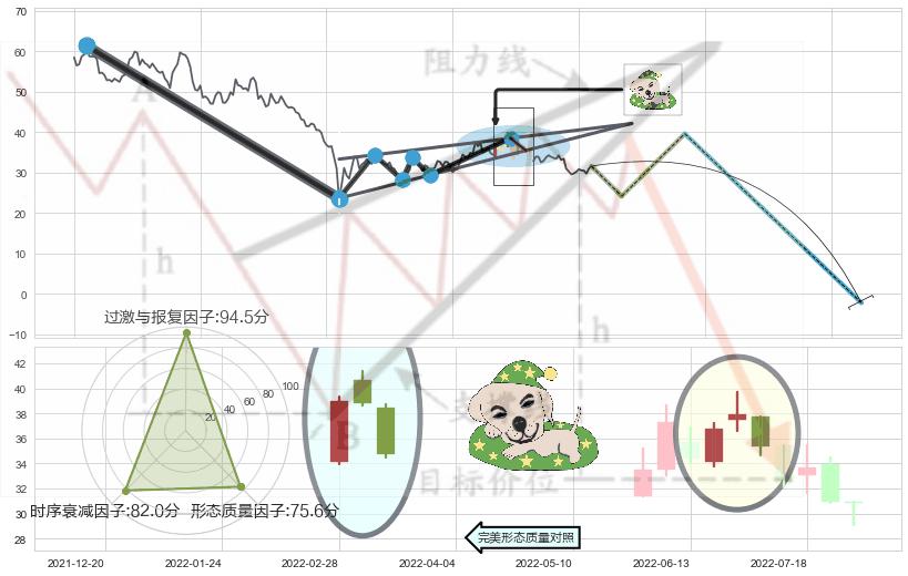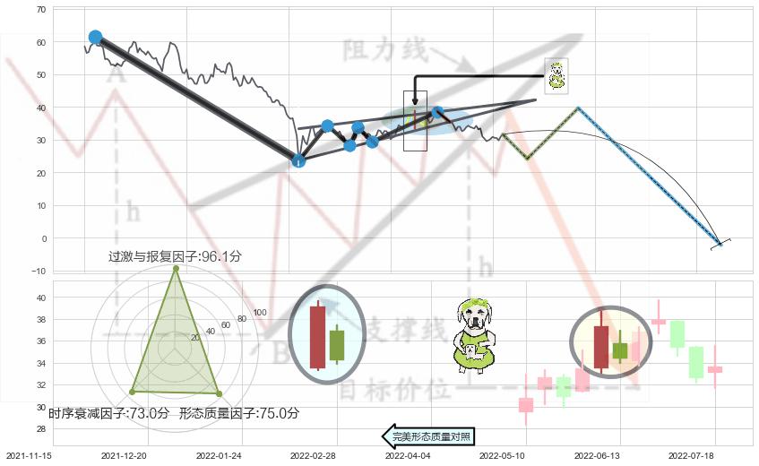 从2021-06-07至2022-04-22,共包含216个交易日,阶段股价下跌-96.82%,阶段股价变动位移路程比: 1 : 5,下跌趋势角度: 45.5