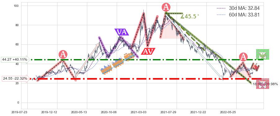 ♘ 阻力价格位44.27,可信任强度73.54%,距离最后交易2022-08-12形成的收盘价格31.60相差 +40.11%