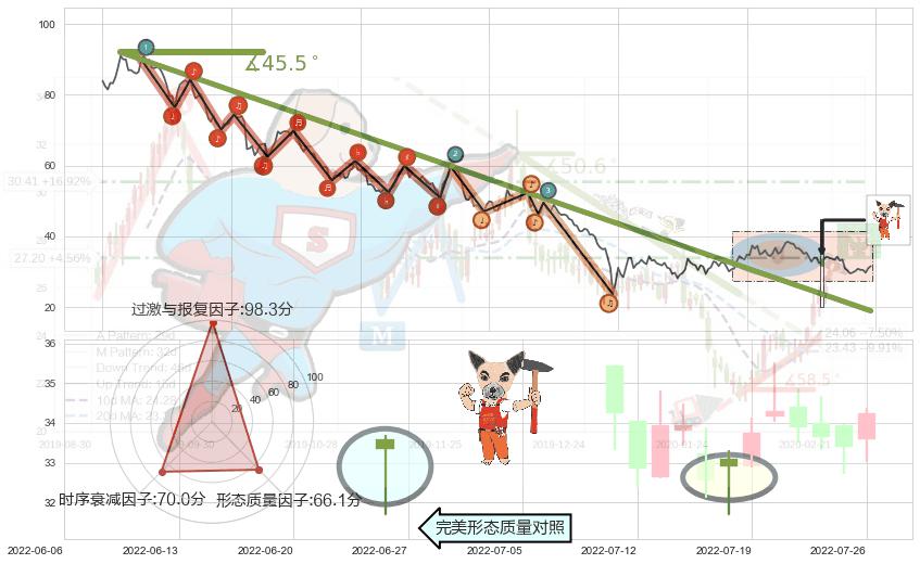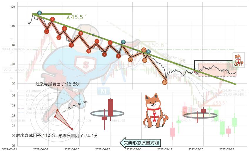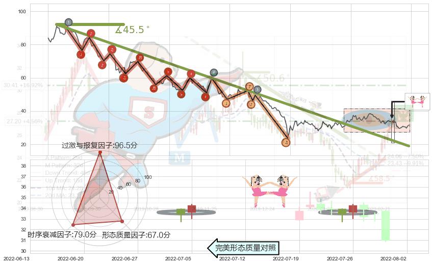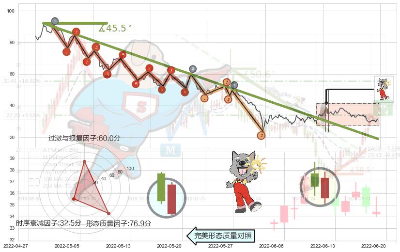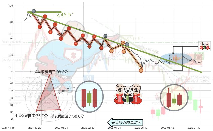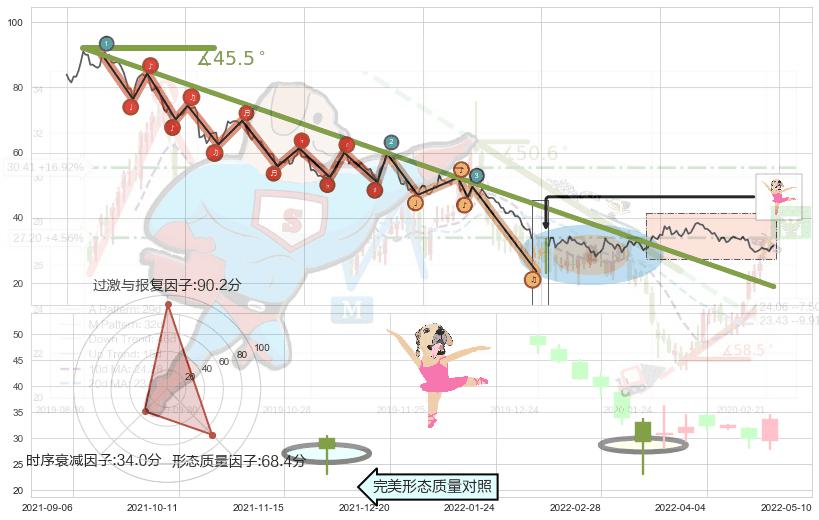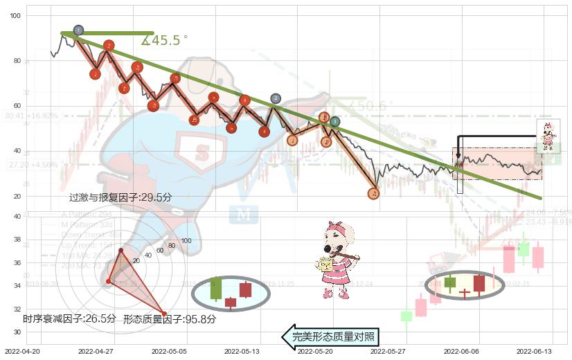 从2021-06-07至2022-04-22,共包含216个交易日,阶段股价下跌-96.82%,阶段股价变动位移路程比: 1 : 5,下跌趋势角度: 45.5