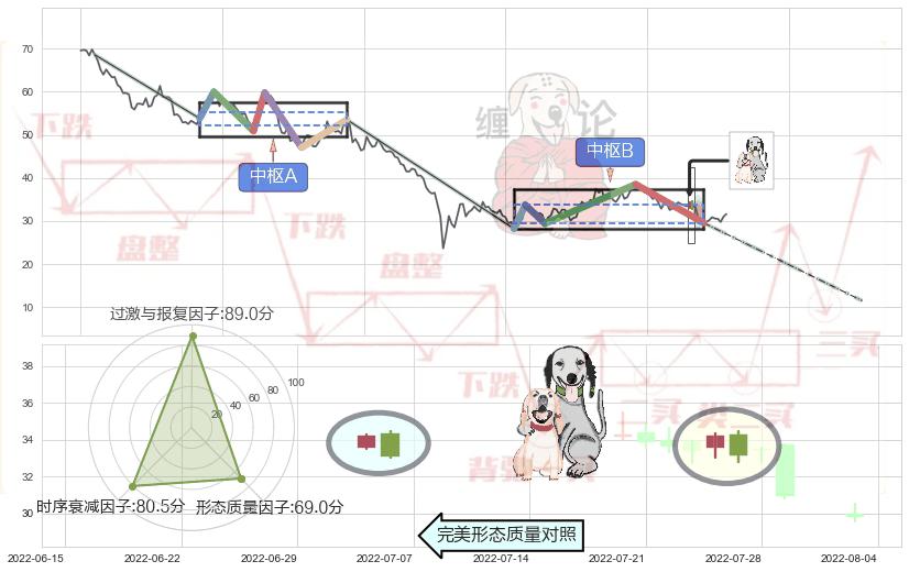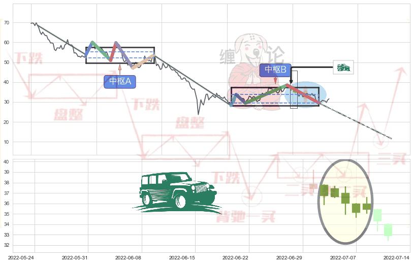 ➣ 【中枢B】:2022-04-25-2022-08-02,中枢由5笔构成,共68交易日, ZG=33.70, ZD=29.55
