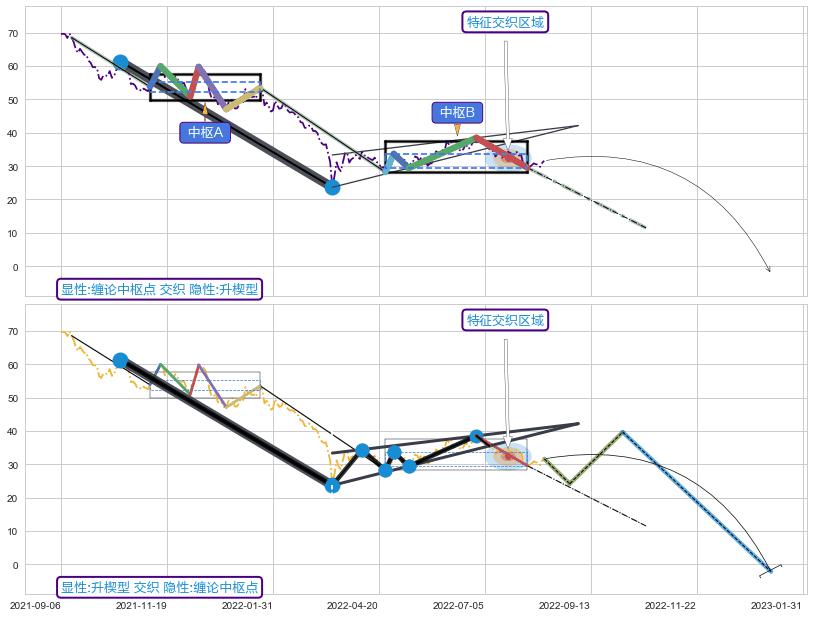 ➣ 缠论中枢点:猜想破位中枢B后持续下拉 → 下跌 → 破位中枢B支撑 → 持续趋势跟踪