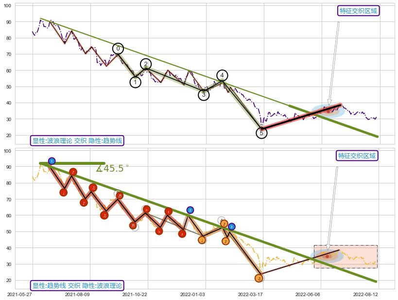 ➢ 波浪理论与趋势线信号事件周期长度级别相同,同周期信号事件