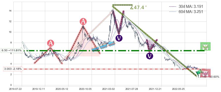 ♘ 支撑价格位3.003,可信任强度54.50%,距离最后交易2022-08-12形成的收盘价格3.070相差 -2.18%