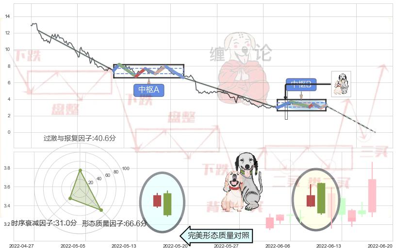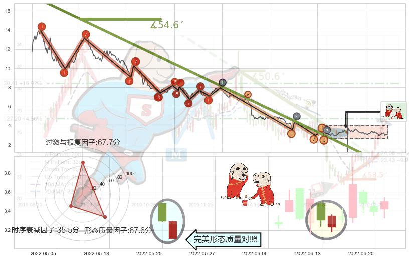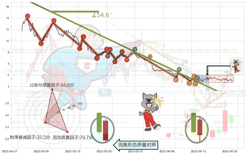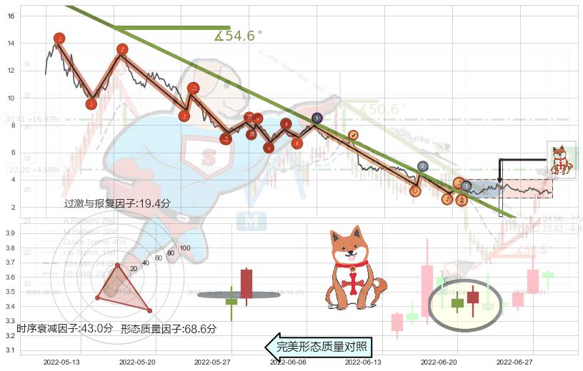 从2021-02-17至2022-06-15,共包含324个交易日,阶段股价下跌-127.04%,阶段股价变动位移路程比: 1 : 5,下跌趋势角度: 54.6