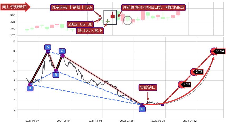 ➢ 收盘价(2022-06-13: 3.300 )→回踩→第一根k线高点(2022-06-07: 3.350 )
