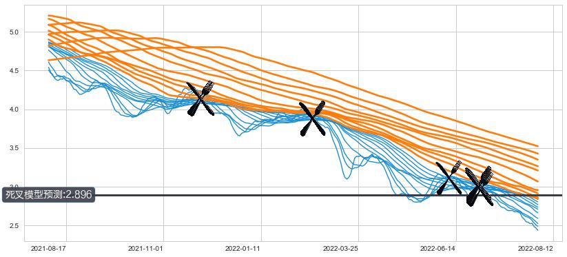 ➣ 40小时均线于(2022-06-29: 2.983)形成【死叉】基于【死叉历史模型】预测死叉后最低波谷价格: 2.663, 死叉后最低价格2.330,已经下跌超出预测最低波谷价格, 预期反弹