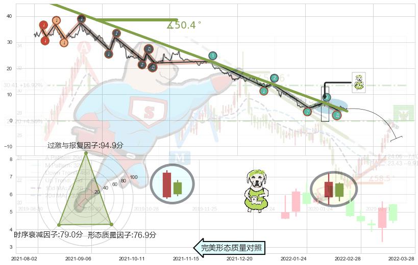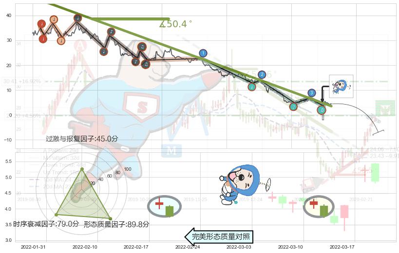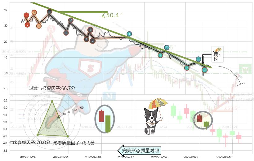 从2020-06-05至2022-03-31,共包含451个交易日,阶段股价下跌-168.04%,阶段股价变动位移路程比: 1 : 7,下跌趋势角度: 50.4
