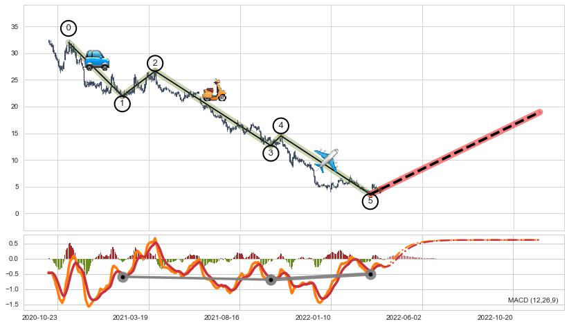 ➣ 趋势线:下跌趋势向上小反弹持续蓄力,猜想阻力位击穿:上涨拉升(大周期均值回复)