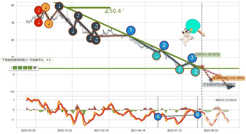 ♘ 在最后的下跌阶段2020-06-05至2022-03-31,存在 破位边缘的阻力位 ,阻力价格3.521,可信任强度84.10%,其距离最后价格4.42相差 -20.34%