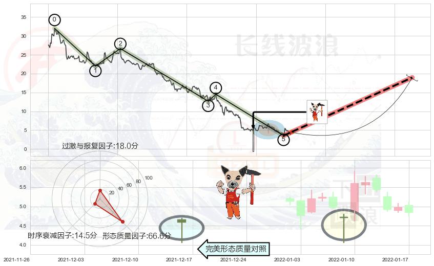 ➣ 锤头线(锤子线) + 波浪理论下跌浪:浪5反弹拐点信号叠加后【反向回撤率】低,【看多】信号叠加【存续影响大】