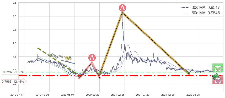 ♘ 支撑价格位0.7966,可信任强度99.19%,距离最后交易2022-08-12形成的收盘价格0.9100相差 -12.46%