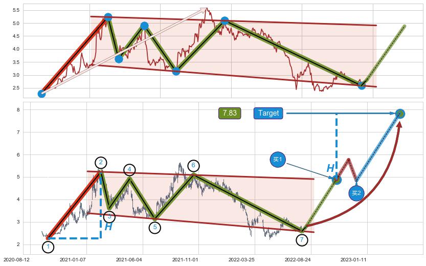 ➢ 最小反转跌幅→𝐇: 2.604 (逐步抬高阻力斜边最后的阻力点⑥与支撑边垂直距离)