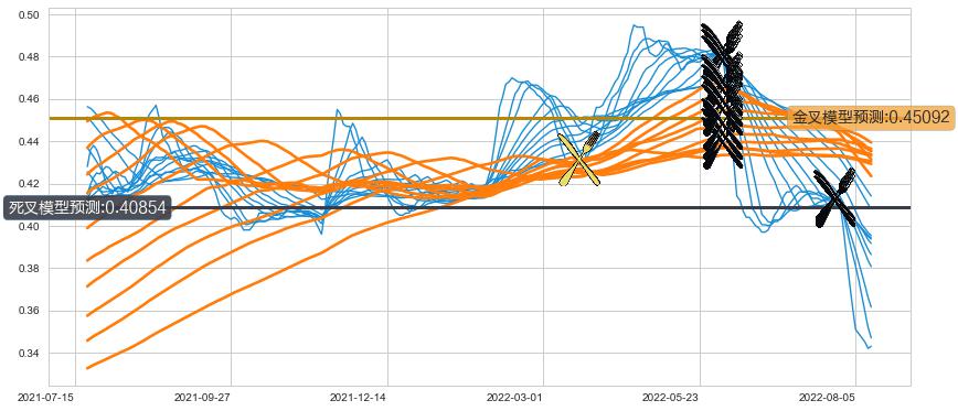 ➢ 21小时均线于(2022-07-27: 0.41429)形成【死叉】基于【死叉历史模型】预测死叉后最低波谷价格: 0.38334, 死叉后最低价格0.33500,已经下跌超出预测最低波谷价格, 预期反弹