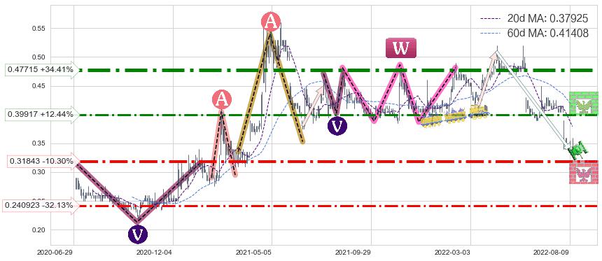 ♘ 阻力价格位0.39917,可信任强度64.91%,距离最后交易2022-08-12形成的收盘价格0.35500相差 +12.44%