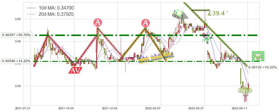 ♘ 阻力价格位0.40546,可信任强度60.91%,距离最后交易2022-08-12形成的收盘价格0.35500相差 +14.22%