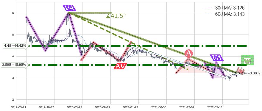 ♘ 阻力价格位3.595,可信任强度85.31%,距离最后交易2022-08-12形成的收盘价格3.100相差 +15.95%