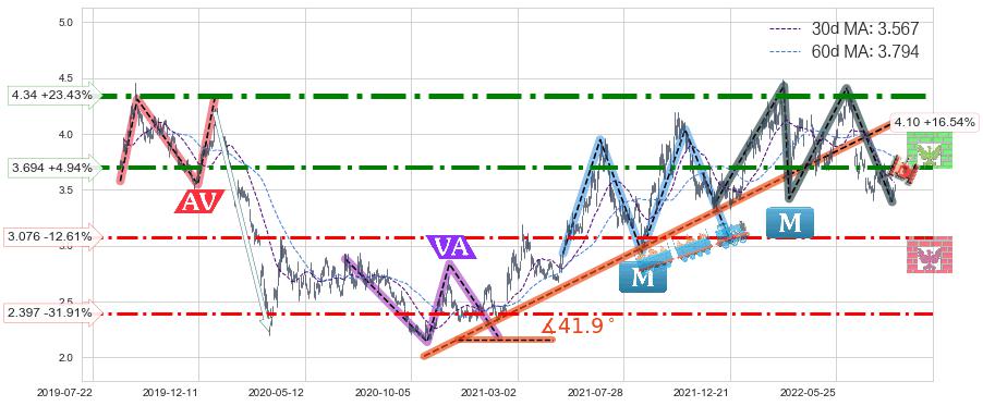 ♘ 阻力价格位3.694,可信任强度82.78%,距离最后交易2022-08-12形成的收盘价格3.520相差 +4.94%