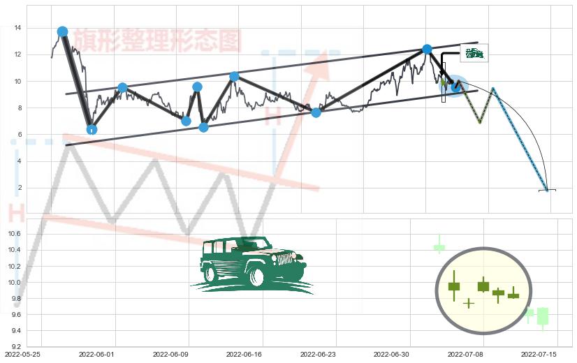 ➣ 升旗形:猜想突破点临近,临近关键支撑位,预期下沉突破下跌