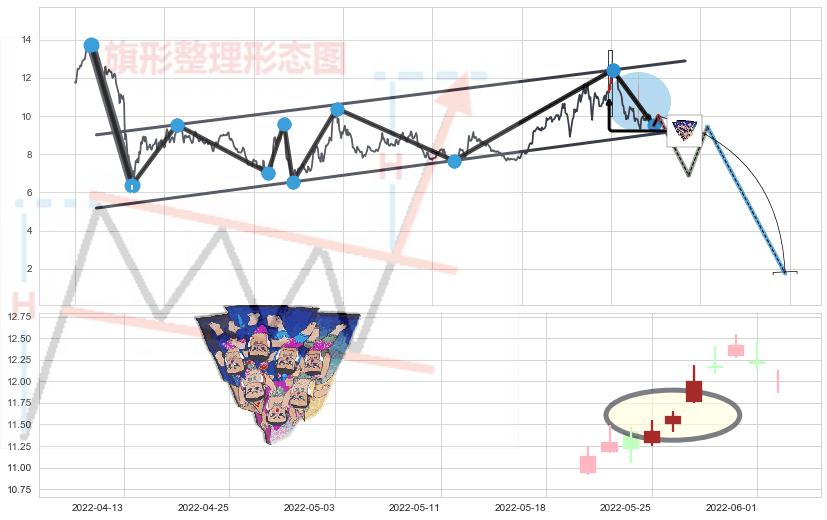 ➢ 升旗形:猜想临近关键支撑位突破点 → 临近拐点下跌 → 风险信号 → 大趋势均值回复