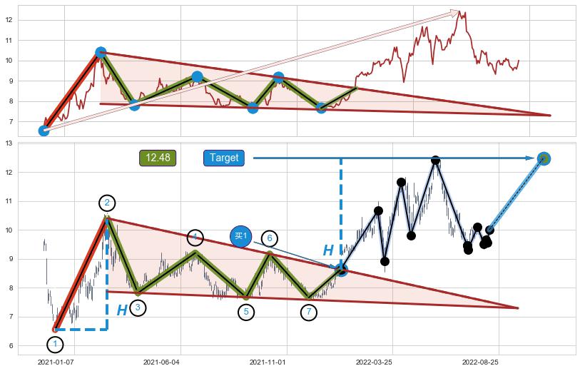 ➢ 【买1】: 激进型 买点 →(2022-01-12: 8.63 )形成突破降🚩楔型【整理】形态