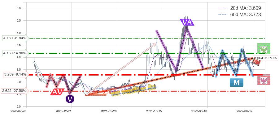 ♘ 支撑价格位3.289,可信任强度88.53%,距离最后交易2022-08-12形成的收盘价格3.620相差 -9.14%