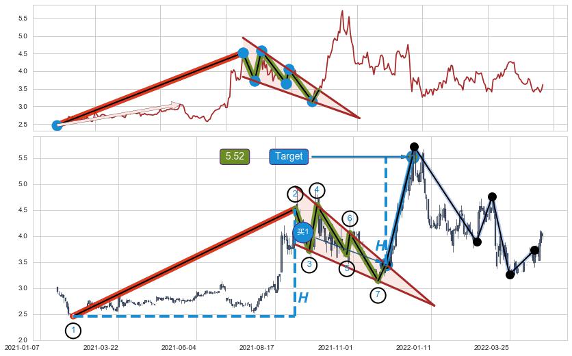 ➢ 【买1】: 激进型 买点 →(2021-11-30: 3.459 )形成突破降🚩楔型【整理】形态