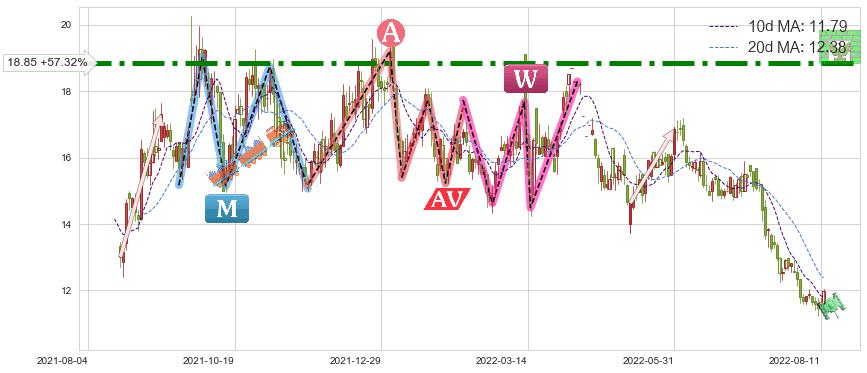 ♘ 阻力价格位18.85,可信任强度98.11%,距离最后交易2022-08-12形成的收盘价格11.98相差 +57.32%