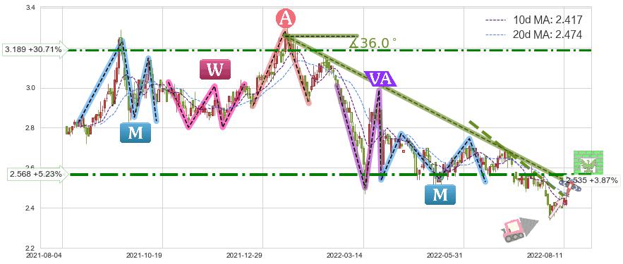 ♘ 阻力价格位2.568,可信任强度80.55%,距离最后交易2022-08-12形成的收盘价格2.440相差 +5.23%
