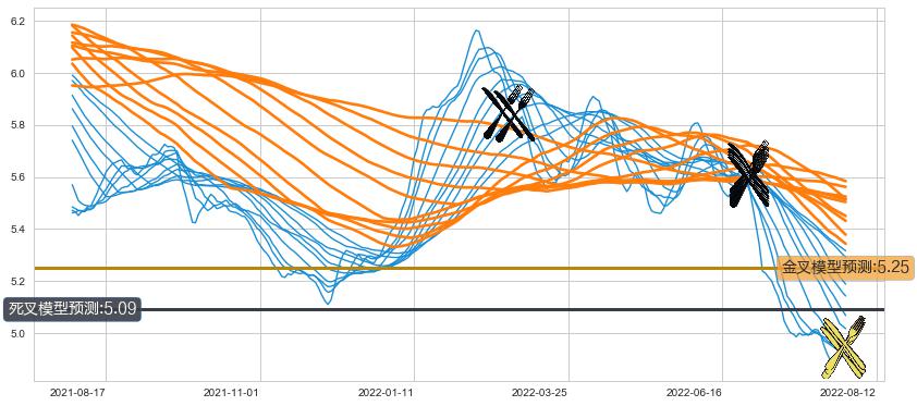 ➢ 34小时均线于(2022-06-28: 5.61)形成【死叉】基于【死叉历史模型】预测死叉后最低波谷价格: 5.30, 死叉后最低价格4.83,已经下跌超出预测最低波谷价格, 预期反弹