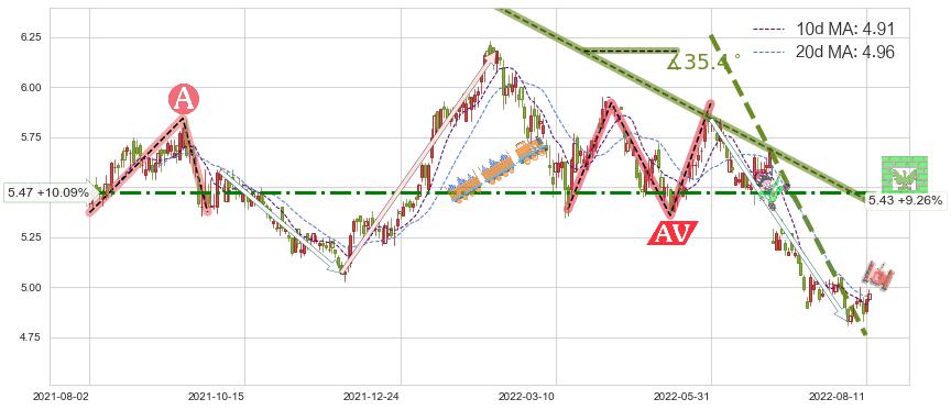 ♘ 阻力价格位5.47,可信任强度66.25%,距离最后交易2022-08-12形成的收盘价格4.97相差 +10.09%