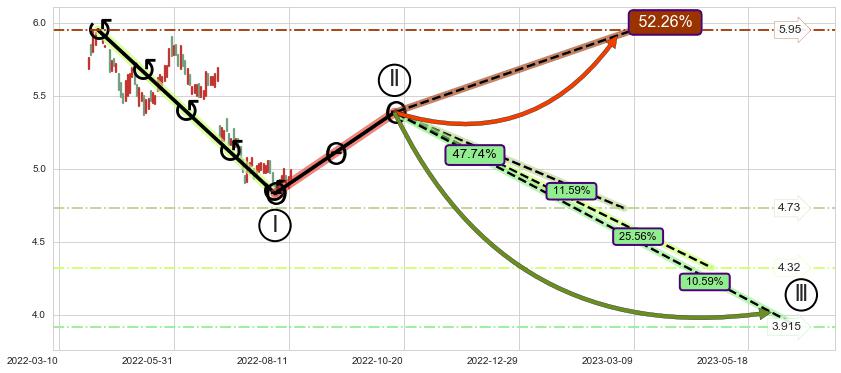 ➣ 循环浪继续向下【平均值】位置(2023-04-26, 4.32),匹配聚类样本比例53.54%, 可能性概率25.56%