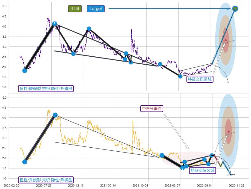 ➣ 看跌(高位倒锤头)流星线 + 降楔型临近target阻力拐点下跌信号叠加后【目标达成率】低,【看空】信号叠加【存续影响大】