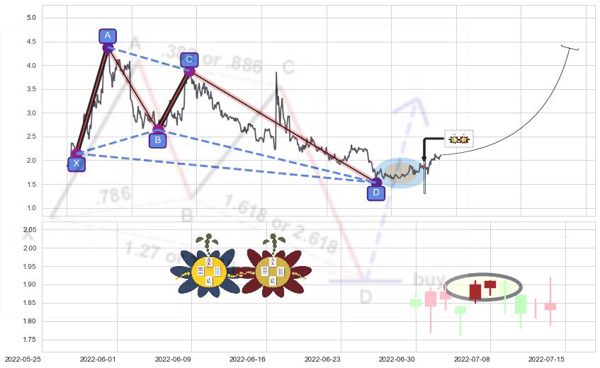 ➢ 谐波蝴蝶:c下跌到达d:猜想拉升 → 上涨 →【拐点】强支撑临近 → 大趋势均值回复