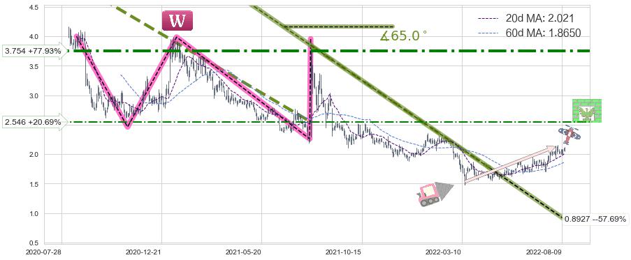 ♘ 阻力价格位2.546,可信任强度54.88%,距离最后交易2022-08-12形成的收盘价格2.110相差 +20.69%