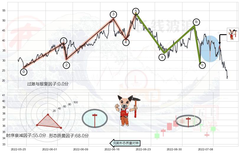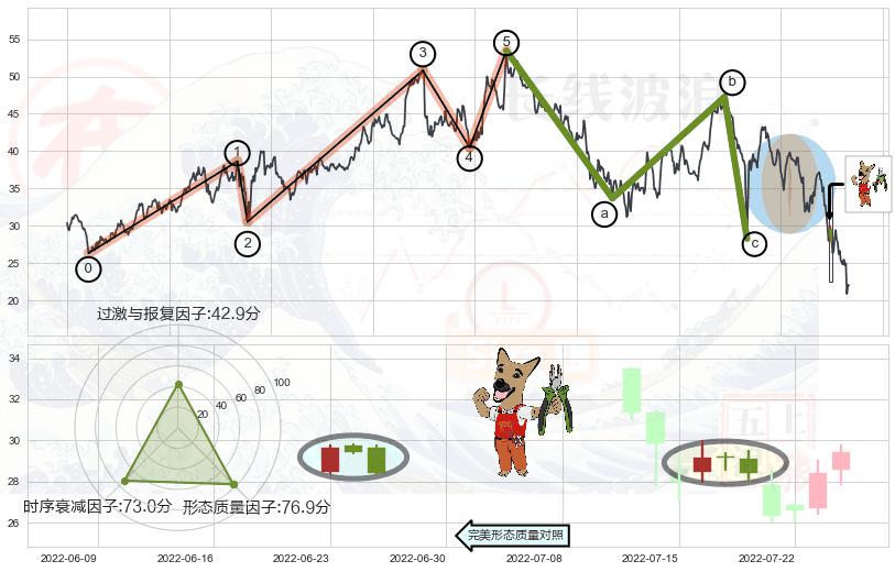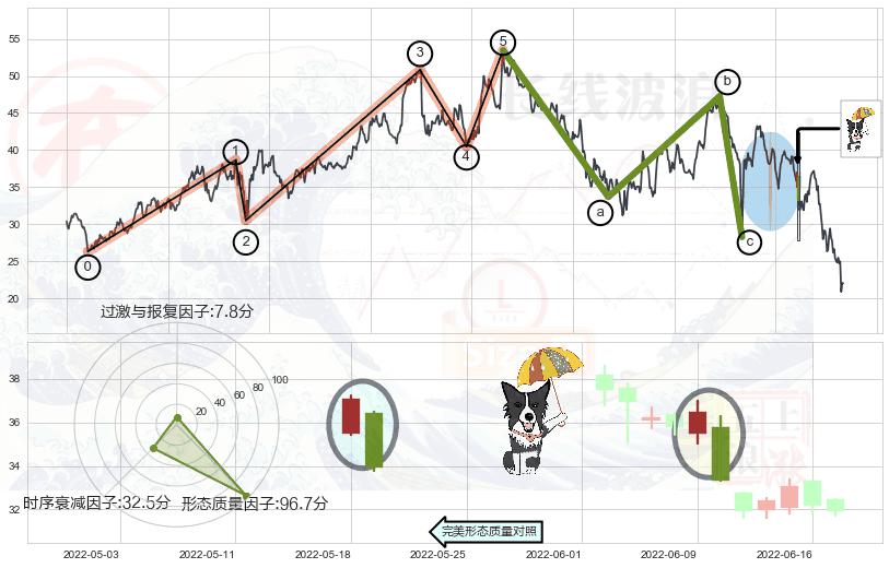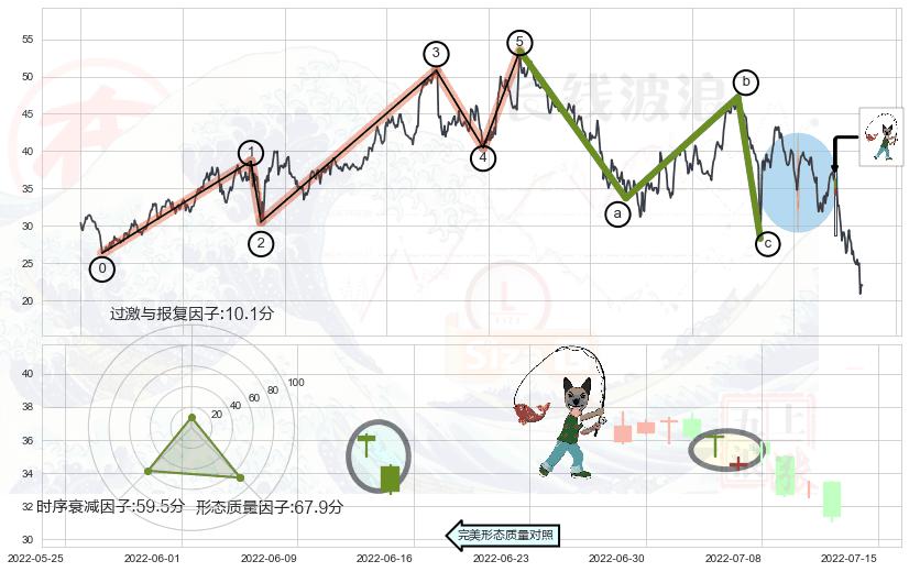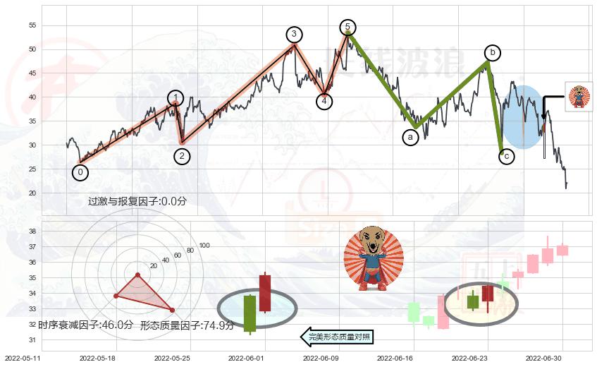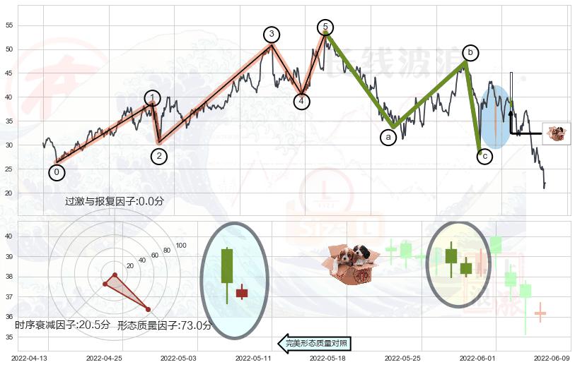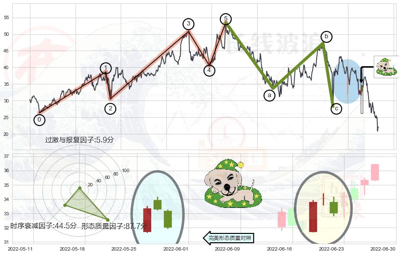 ➢ 看跌(高位倒锤头)流星线 🔜 波浪理论击穿破位C点继续下跌 综合量化分数:43.74 【偏空】