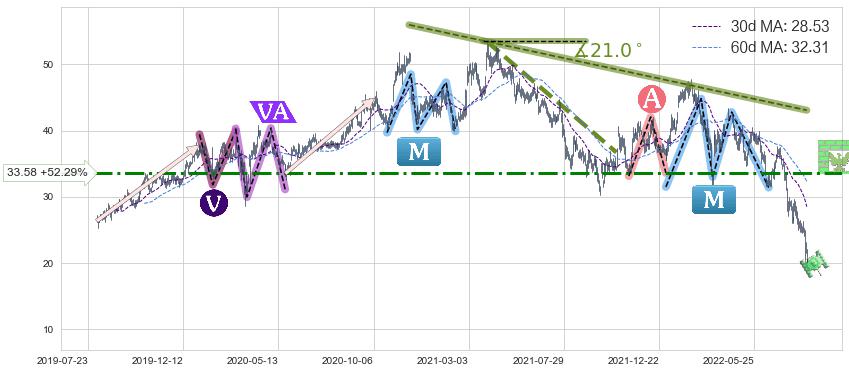➢ 【多方力量耗尽,空方打破攻守平衡点】下降三角形中继整理, 已在2022-07-21突破【支撑】颈线 28.30 →演变成下降通道